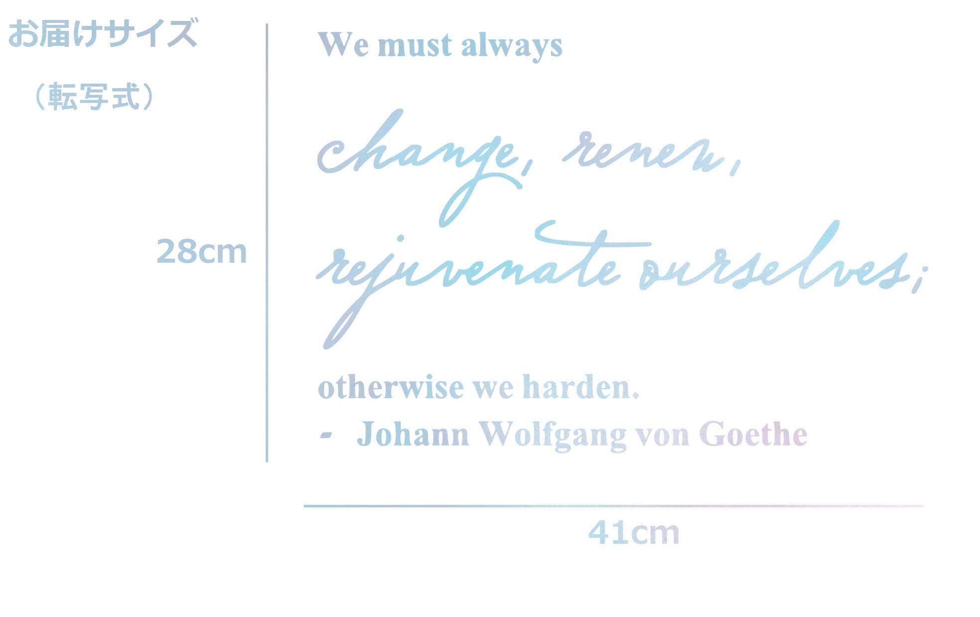 白の下地に空色、ピンク混合のスプレーアート(水性)で色合いが1品1品異なります。ゲーテの名言ウォールステッカー We must always change, renew, rejuvenate ourselves; otherwise, we harden. 「我々はつねに、自らを変え、再生し、若返らせないといけない。 そうしないと、凝り固まってしまう。」